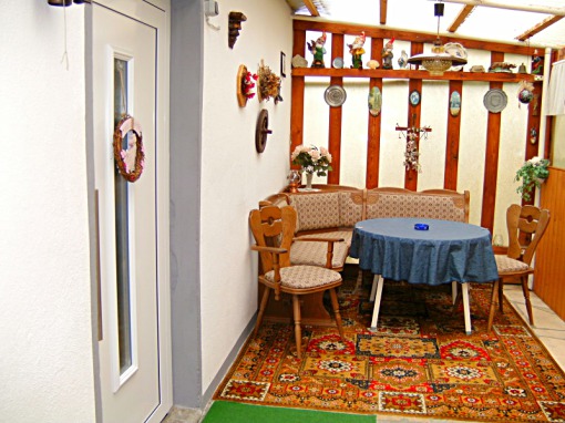 Der ringsherum abgeschlossene Eingangsbereich mit Sitzgruppe, den wir gerne als "falschen Wintergarten" bezeichnen, bietet eine hervorragende Wohnraumerweiterung - auch an kühleren Tagen.